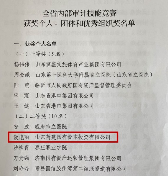 日前,由山東省審計廳、省人力資源和社會保障廳、省總工會聯(lián)合舉辦的2024年全省審計職業(yè)技能競賽圓滿結束。菏建國投審計法務部部長汲艷麗同志在52名決賽選手中脫穎而出,以總分第7名的好成績榮獲省內(nèi)部審計技能競賽個人賽二等獎。